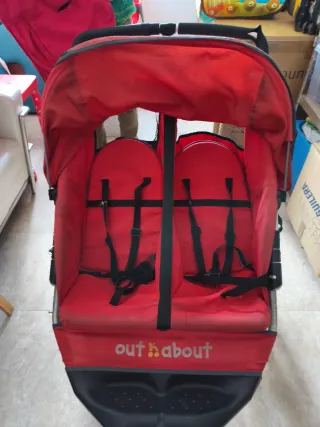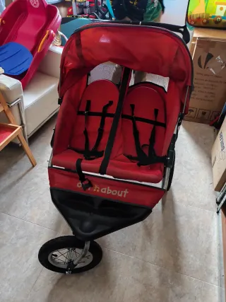 Carro gemelar de color rojo, ideal para llevar a dos niños cómodamente. - Capota doble para proteger del sol. - Arnés de seguridad de 5 puntos. - Ruedas todoterreno para mayor maniobrabilidad. - Incluidos dos sacos a conjunto. - Mosquitera.