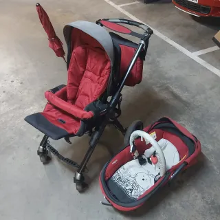 Conjunto de silla de paseo y capazo para bebé en color rojo y negro. - Silla de paseo con estructura plegable. - Capazo con asa de transporte y acolchado interior.
