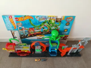 ¡Diversión asegurada con esta pista Hot Wheels! - Incluye un set de lavado de coches con temática de pulpo. - Compatible con coches Hot Wheels. - Ideal para horas de juego creativo.