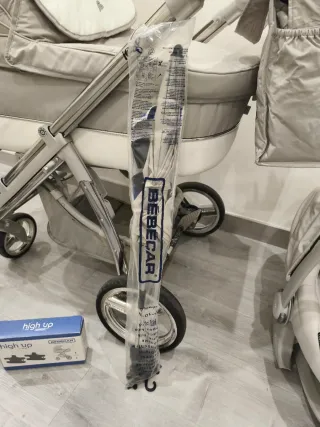 Pack de cochecito Bebecar en muy buen estado. - Chasis cromado. - Ruedas grandes y pequeñas. - Cesta de almacenaje. - Marca: Bebecar. Incluye : capazo, silla y maxi-coxi también incluye sombrilla a juego