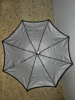 Sombrilla para carro de bebé de la marca Casualplay. Original diseño cuadrado, con doble varilla por esquina Medidas: 60x60 ctm+/- Color negro y plateado por dentro Fácil de instalar con adaptador universal Varilla central flexible En buen estado aunq tiene un desperfecto en el muelle. Pero tiene tanta fuerza que no afecta a su utilizacion