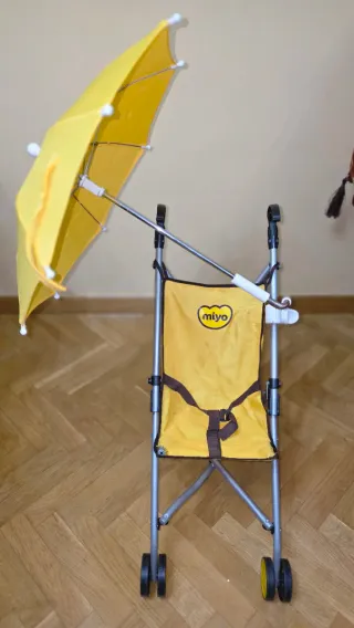 Carro de muñecas de la marca Miyo en color amarillo. - Estructura metálica. - Parasol amarillo incluido. - Arnés de seguridad.