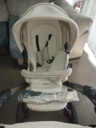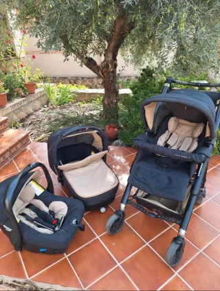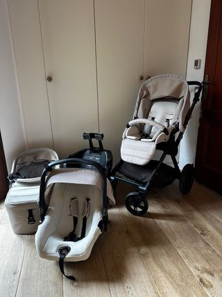 Carrito de bebé Trio Jane Rider en color beige y negro. - Capazo. - Silla de paseo. Se puede poner en ambas posiciones mirando hacia ti y mirando hacia fuera. - Grupo 0+ para el coche y se puede poner en el carrito también. - sombrilla - plástico de lluvia - bolso - freno de mano en el manillar - se desenfunda todo. - manillar regulable en 5 alturas - suspensión regulable