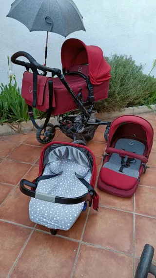 Vendo pack del carrito bebé Muum compuesto por: - Base Isofix Koos Platform perfecto para la maxicosi Koos - Maxicosi Koos con capota parasol (para bebés muy pequeños haría falta comprar un reductor) - Capazo Muum con capota extra grande que incluye rejilla de ventilación. Cambié el colchón original que era muy fino por uno nuevo de espuma. - Silla de paseo con un colchoncillo y las tiras regulables. Puede ir orientado hacia delante y hacia atrás. Lo he usado para mis dos hijas, tiene signos de uso. Lo entrego con todos los accesorios y todas las telas limpias de tintorería.