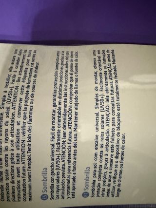 Sombrilla plateada con soporte universal para carritos UV50+. Nunca usada, siempre ha estado guardada. Tiene un mango articulado y flexible que permite ajustarla a multitud posiciones. Cuenta con dos abrazaderas de sujeción que permite adaptarse a casi todos los carritos.