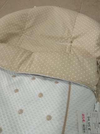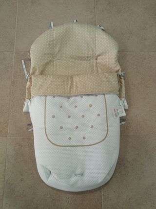 Saco para silla de paseo con un diseño encantador y práctico. Marca Rosy Fuentes en tejido de piqué - Parte superior en color beige con lunares blancos. - Parte inferior en blanco con detalles de lunares. - Ribete en color camel.