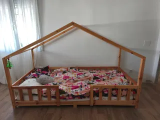 Cama infantil estilo Montessori, perfecta para habitaciones infantiles tanto de niño como de niña. Su diseño abierto fomenta la independencia y es fácil de hacerla cama porque el techo es alto y abierto. En las imágenes se puede ver cuando la compramos y cuanto costó. Está como nueva. Se entega sin colchón. Montada o semi desmontada. No se hacen envíos debido al volumen del producto. - Medidas: 90 x 200 cm. - Material: Madera de pino barnizada acabado natural