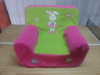 Acogedor sillón infantil con un divertido diseño. - Tapicería suave de color rosa y verde. - Adornado con un simpático conejito bordado. - Detalles de corazones y flores. - Ideal para el rincón de juegos. - Con cremallera para desenfundar y lavar