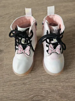 Botas de Minnie Mouse para niña de la talla 23. Son muy cómodas ya que llevan cremallera y cordones, y la suela es de goma, por lo que son ideales para los días de lluvia y nieve.