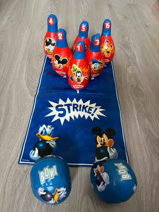 Set de bolos blanditos con personajes de Disney. Incluye 6 bolos y 2 pelotas. - Diseños de Mickey Mouse, Donald y Goofy. - Bolos con números del 1 al 6. - Pelotas con la palabra BOWL.