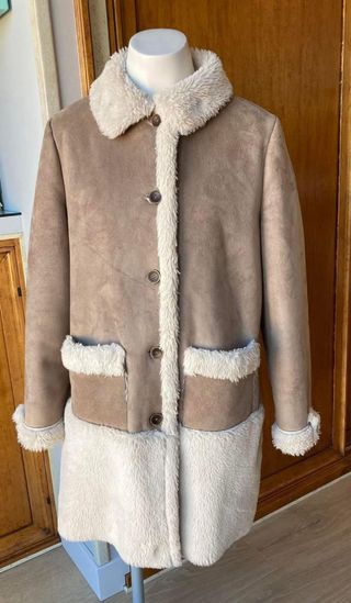 Abrigo de Pili Carrera para niña, con un diseño elegante y cálido. Talla 12 años tipo piel vuelta. Lavable. - Exterior en tono marrón suave. - Forro interior de pelo blanco. - Cierre de botones. - Bolsillos delanteros con detalle de pelo. Impecable. Facilito medidas