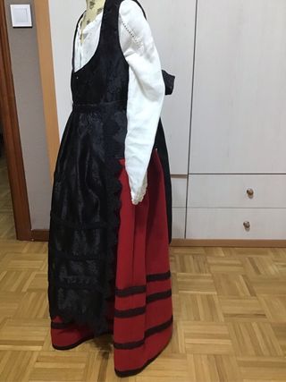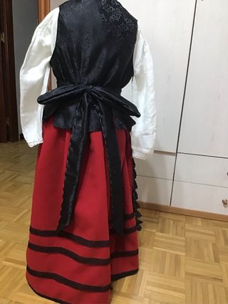 Traje regional para niña, estilo piñorra. Compuesto por falda roja con detalles negros - Chaleco negro con bordados. - Lazada negra en la cintura. - Falda larga roja. - Delantal con Pasamaneria