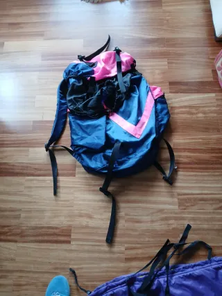 Saco de dormir de color morado, ideal para camping o actividades al aire libre. Incluye una colchoneta enrollable azul. - Saco de dormir morado. - Colchoneta enrollable azul con correas negras.