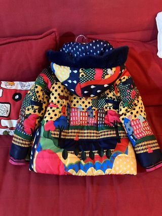 Abrigo original de la marca Rosalita con un diseño muy colorido y alegre, muy original llama la atención. - Estampado vibrante con múltiples motivos. - Capucha con detalle de pelo. - Cierre de cremallera frontal.