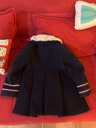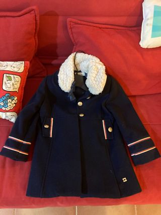 Precioso abrigo azul marino para niña de la marca Dolce Petir. Un diseño original y elegante. - Cuello de pelo sintético blanco. - Detalle de cintas en puños y bolsillos. - Botones dorados. - Pequeño logo metálico en la parte inferior.