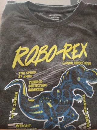 Camiseta de manga larga con estampado de ROBO-REX. - Diseño frontal con dinosaurio robótico. - Texto ROBO-REX en amarillo. - Detalles técnicos del robot impresos.
