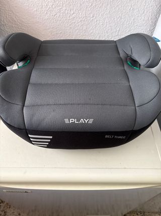 Alzador para coche con diseño moderno y cómodo. - Color gris oscuro. - Logo PLAY en la parte frontal. - Detalle de líneas blancas en la base. - Etiqueta BELT THREE en el lateral. - En perfecto estado, usado 1 año
