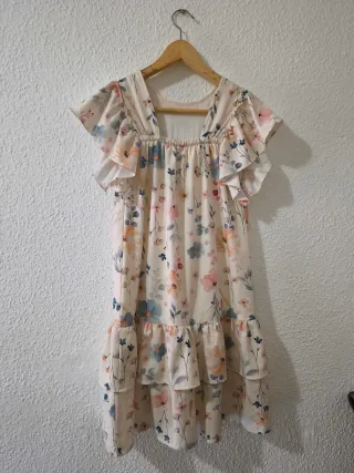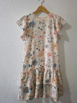 Vestido de niña con estampado floral y volantes. - Diseño con escote cuadrado. - Mangas cortas con volantes. - Falda con varios niveles de volantes.