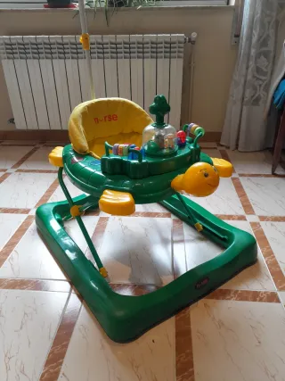 Andador para bebés con diseño de tortuga. - Color verde y amarillo. - Asiento acolchado. - Juguetes interactivos en la bandeja con música que funciona perfectamente ( pilas no incluidas)