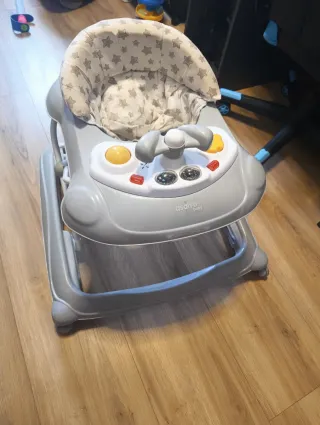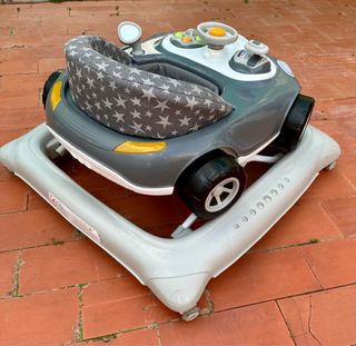 Tacatá con diseño de coche para bebés, en muy buen estado. - Asiento acolchado con estampado de estrellas. - Volante y panel de actividades. Desmontable y sirve como trona. - Ruedas para facilitar el movimiento.