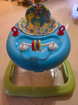 Tacatá para bebé en buen estado, con asiento acolchado y bandeja de juegos. - Asiento acolchado. - Bandeja de juegos con luces (excepto una que ya no funcionaba desde el principio)y sonidos. - Ruedas giratorias.