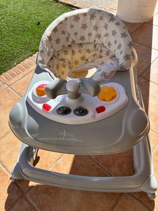 Andador o tacatá de la marca Asalvo, ideal para los primeros pasos. - Asiento acolchado con estampado de estrellas. - Bandeja de actividades con diferentes juguetes. - Estructura de plástico resistente.