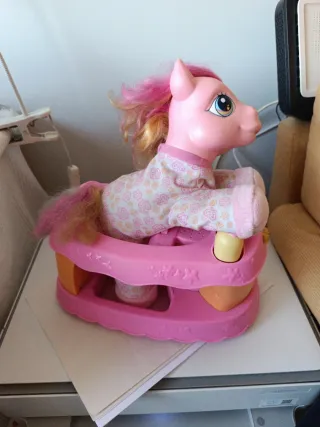 Juguete de My Little Pony, un pony bebé sentado en su tacatá. - El pony es de color rosa con crin y cola rosas. - Lleva puesto un pijama con estampado floral. - El tacatá es de color rosa y naranja, con un corazón amarillo. - El nombre My Little Pony está grabado en el tacatá.