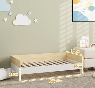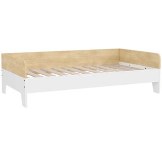Cama infantil con un diseño moderno y funcional, combinando blanco y madera natural. - Estructura de cama con somier de lamas. - Panel trasero y laterales en madera clara. - Base de cama en color blanco.