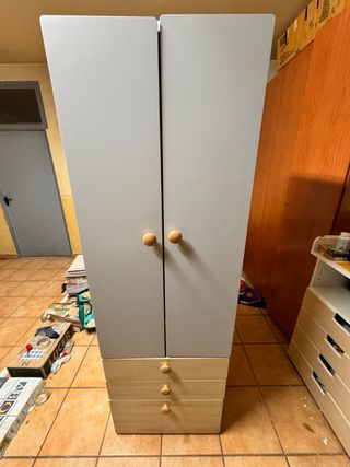 Armario infantil de Ikea con un diseño moderno y funcional. Perfecto para organizar la ropa y juguetes. - Dos puertas superiores. - Tres cajones inferiores. - Tiradores redondos de madera. Tiene algunos desperfectos en los laterales (ver foto)