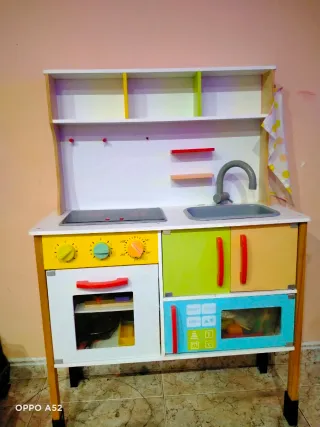 Divertida cocina de juguete de la marca Aldi, perfecta para los más pequeños. - Diseño moderno con detalles en color turquesa. - Incluye horno, microondas y lavavajillas. - Pila con grifo. - Encimera con fogones. - Reloj decorativo. no tiene puestas las "patas" porque por altura ya nos iba bien así. Pero las tengo en una bolsita listas para poner si lo necesitais.