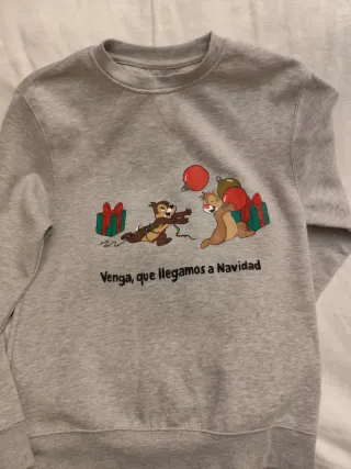 Sudadera gris con un diseño navideño pintado a mano de Chip y Chop. - Personajes de Disney Chip y Chop. - Motivo de Navidad con regalos y adornos. - Texto Venga, que llegamos a Navidad. Totalmente nueva. Pintada a mano, se puede lavar