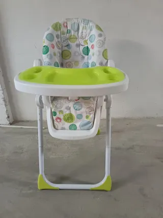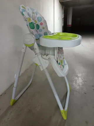 Trona infantil con un alegre estampado de círculos en tonos verdes, azules y rojos. Perfecta para las comidas de los más pequeños. - Bandeja extraíble. - Asiento acolchado. - Estructura plegable para fácil almacenamiento.