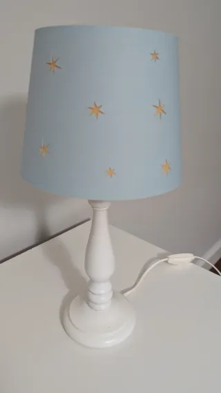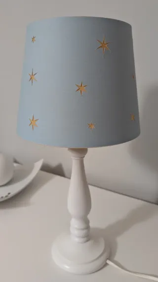 Lámpara de mesa con base de madera blanca y pantalla azul decorada con estrellas doradas. - Base de madera. - Pantalla de tela azul. - Diseño de estrellas.