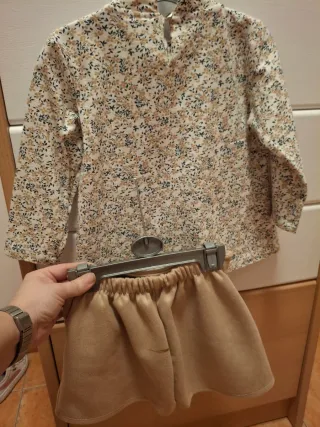 Conjunto de tres piezas para niña de 36 meses. - Blusa de manga larga con estampado floral. - Falda-Pantalón de color beige con detalle de botón. (Lleva una manchita como si fuera quemado en la parte trasera, se aprecia en una de las fotos) - Boina (nunca usada)