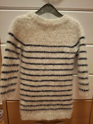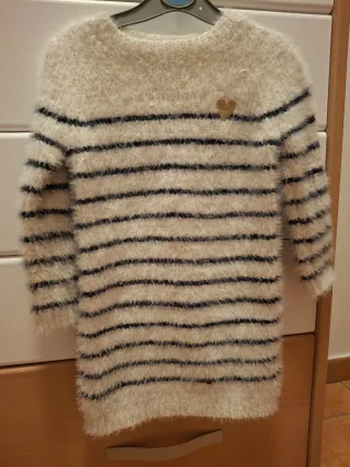 Vestido de punto para niña de 4 años, con un diseño de rayas y un detalle de corazón. - Tejido suave y mullido. - Diseño de rayas horizontales. - Pequeño corazón dorado bordado en la parte superior.