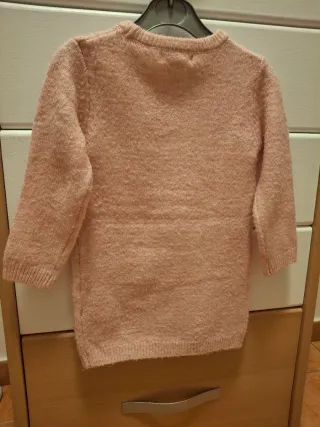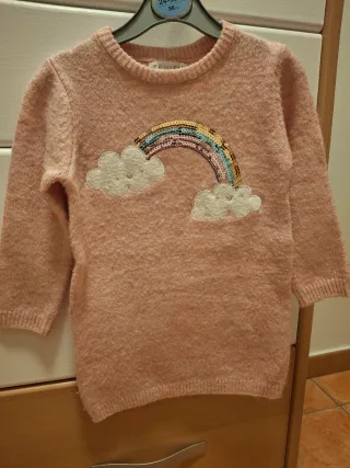Vestido de punto rosa para niña con un bonito diseño de arcoíris y nubes. - Talla 2-3 años. - Detalle de lentejuelas en el arcoíris. - Nubes de aplique. - Cuello redondo y manga larga.
