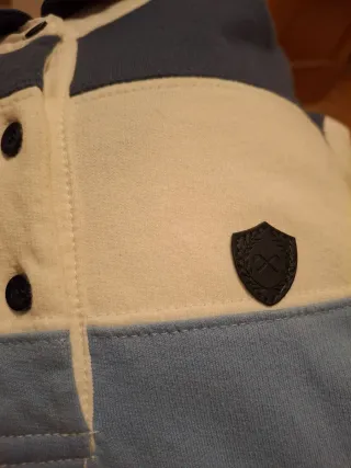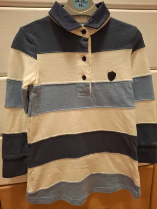 Vestido de manga larga para niña con un diseño de rayas. - Rayas horizontales en tonos azul marino, azul claro y blanco. - Cuello tipo polo con botones. - Pequeño escudo decorativo en el pecho. (USADO EN UNA OCASIÓN)