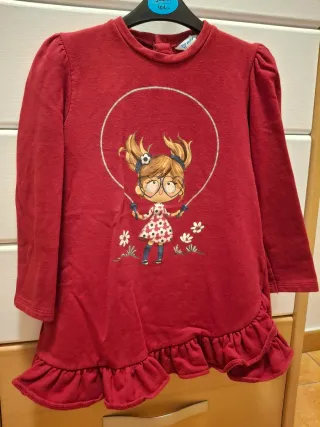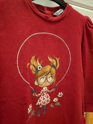 Vestido de manga larga para niña de la marca Mayoral. - Color rojo. - Estampado de niña saltando a la comba. - Volantes en el bajo. - Usado en 1 ocasión.