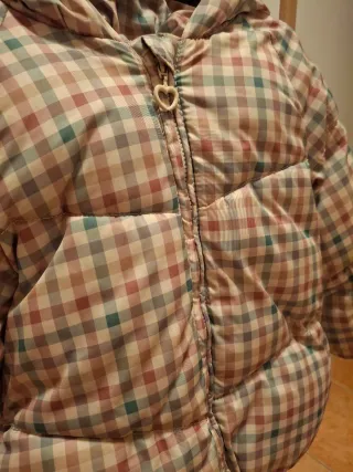Abrigo acolchado de cuadros para niña. - Diseño a cuadros en tonos pastel. - Cierre de cremallera con tirador en forma de corazón. - Capucha integrada.