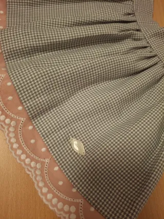 Preciosa falda de la marca Miranda para niña de 2 años. Con un diseño clásico y detalles encantadores. - Estampado de pata de gallo en gris y blanco. - Adorno de puntilla rosa con topos blancos en el bajo. - Cierre con botón. - Lleva botón para ajustar la cintura. -(Nueva sin etiqueta)