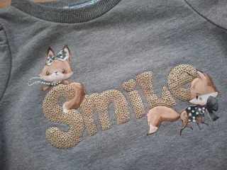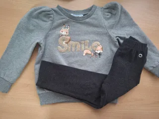 Conjunto de dos piezas para niña de la marca Mayoral, talla 3 años. Incluye sudadera gris con estampado de zorros y lentejuelas, y pantalón largo gris oscuro. - Sudadera con mangas abullonadas. - Detalle de zorros y la palabra Smile bordada con lentejuelas. - Pantalón con cintura elástica.