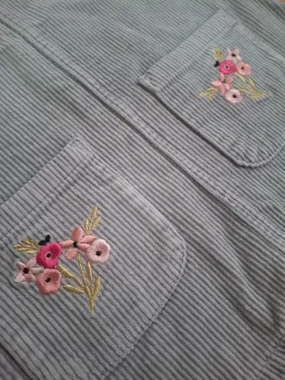 Vestido de pana con un bonito bordado floral en los bolsillos delanteros. - Tela de pana suave. - Tirantes con botones. - Dos bolsillos frontales. - Diseño con bordado de flores.