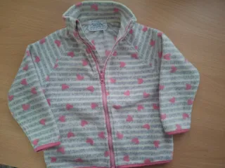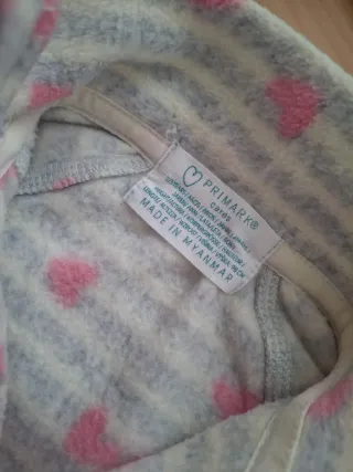 Chaqueta de forro polar para niña de la marca Primark, talla 2-3 años. Ideal para mantenerla abrigada. - Diseño a rayas grises y blancas. - Estampado de corazones rosas. - Cierre de cremallera frontal. - Cuello alto. - Puños y bajo con ribete rosa.