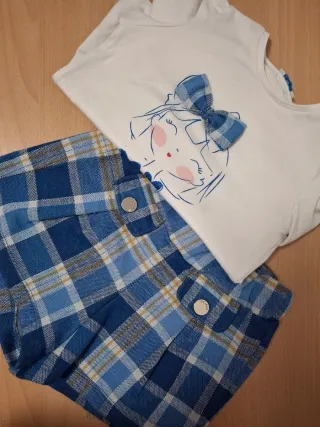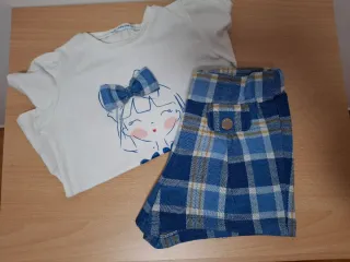 Conjunto de camiseta blanca con dibujo de niña y lazo, y pantalón corto de cuadros. - Camiseta blanca con estampado frontal. - Pantalón corto de cuadros azules y amarillos. (En una de las imágenes se aprecia en la camiseta unas manchitas que tiene de ahi su precio...)