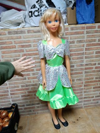 Muñeca grande estilo Miss. Mide 104 cm - Vestido verde brillante con detalles plateados. - Zapatos negros. - Cabello rubio y ojos azules.