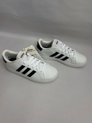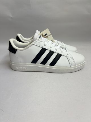 Zapatillas deportivas de la marca Adidas con un diseño clásico. - Combinación de colores blanco y negro. - Tres franjas laterales características de la marca.