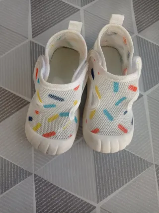 Zapatillas blancas de malla para niño/a con un divertido estampado de líneas de colores. Ideales para verano. Se han usado tres veces. Completamente respetuosas. Talla 22. De Shein. - Diseño transpirable. - Cierre fácil. - Estampado multicolor.