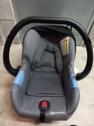 Silla de coche para bebé en color gris, con detalles en azul y asa negra. - Diseño moderno y funcional. - Incluye cojín reductor. - Asa de transporte ergonómica. - Marca: Kinderkraft.