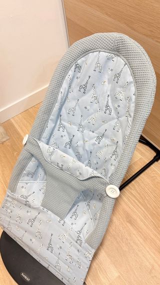 Nuevas de LIQUIDACION solo 1 disponible . Hechas artesanalmente una a una . Funda para hamaca BabyBjörn con un bonito estampado de jirafas sobre fondo azul claro. El borde y la zona del cuello son de tejido gris de gofre. - Estampado de jirafas. - Tejido de gofre gris.