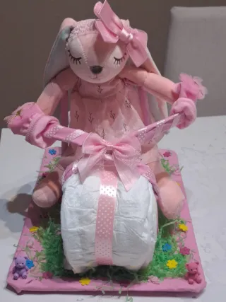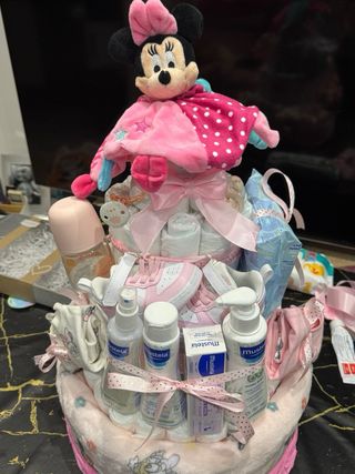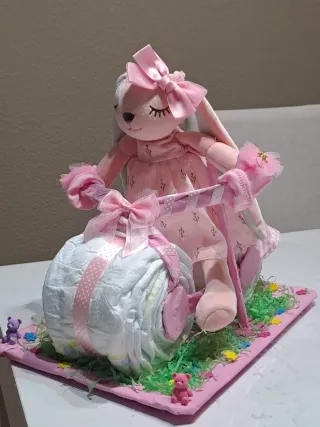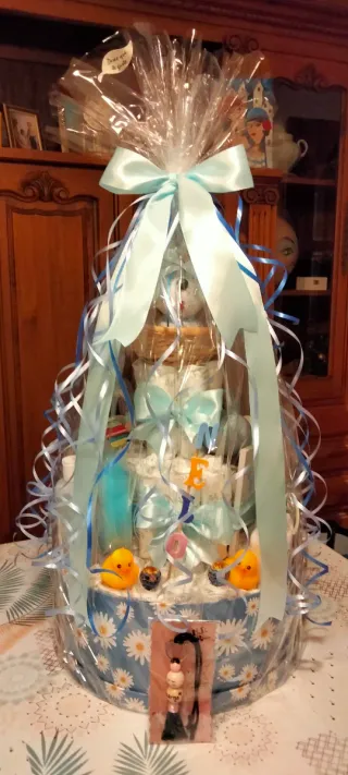Podrás personalizarla a tu gusto. Pide presupuesto!!! Tartas, cestas, cunas, castillo.... Todo hecho con pañales y productos de bebé!! Se original y regala a los nuevos papás algo que no olviden jamás!!!